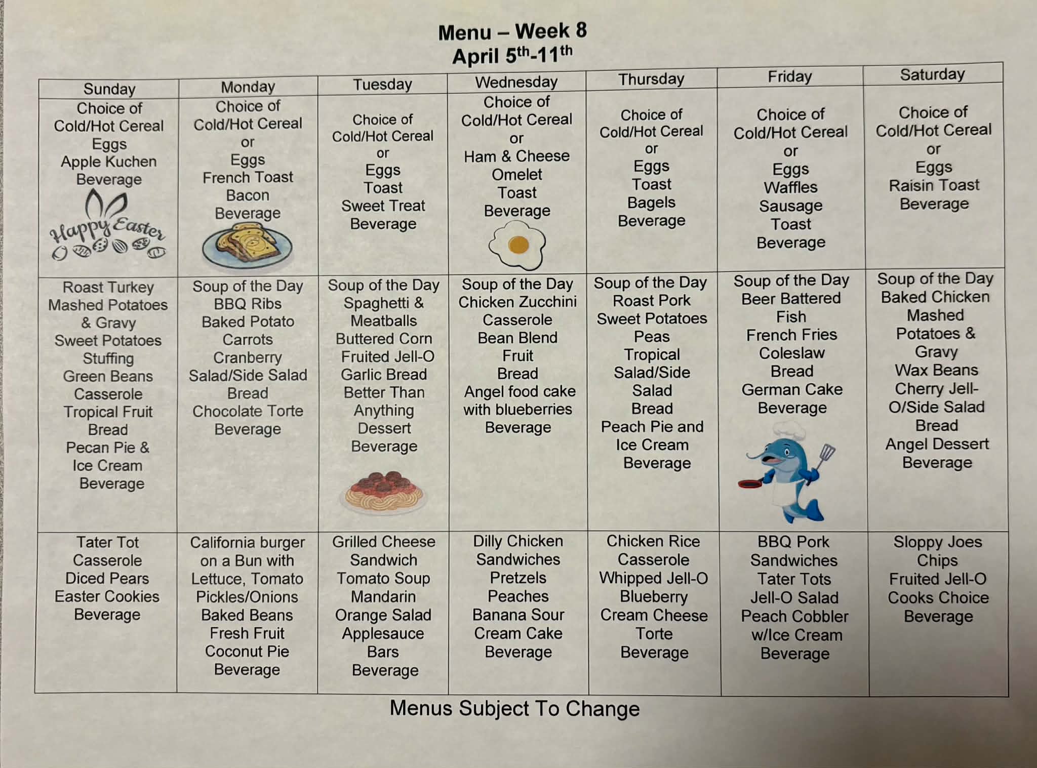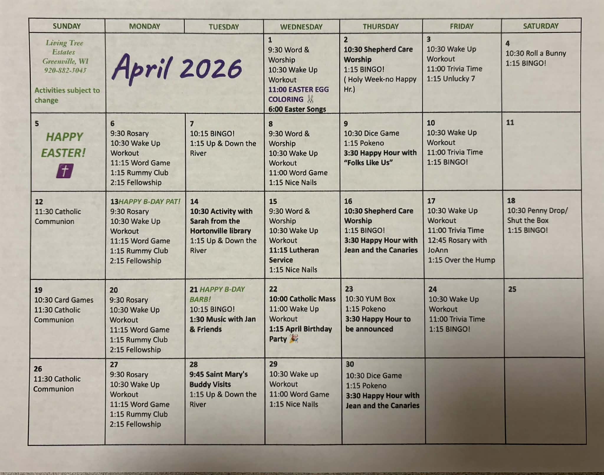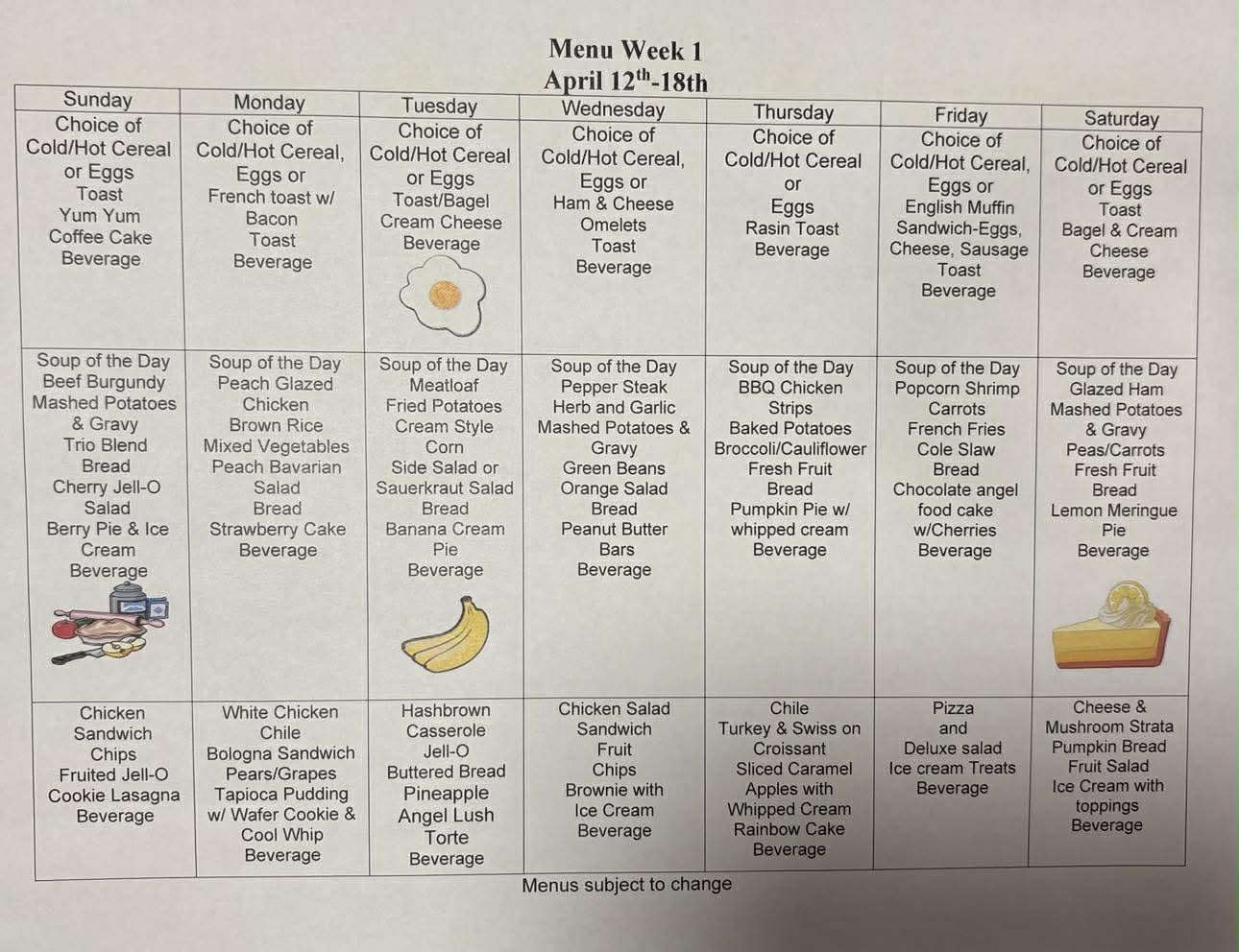 Below is our current Activities Calendar and Menu. We will do our absolute best to keep these up to date for you.